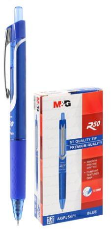 Gél toll az M&G márkától, az R50 alkategóriából. Ez egy „klasszikus dizájn vagy más szóval „régi klasszikus. A golyó átmérője 0,5 mm . A toll utántöltő kék színű.