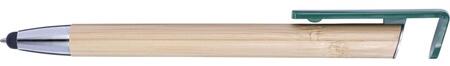 Golyóstoll és érintő kék tollbetéttel, műanyag klipsszel és nyomógombbal. A klipsz nyomógombként funkcionál, és okostelefon-állványként is használható. ABS, bambusz. Termékméret: 14,5 cm Szín: natúr és zöld Emblémázását, feliratozását vállaljuk.