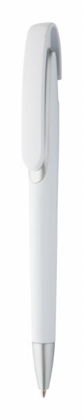 Fehér testű, műanyag golyóstoll, ezüst hatású tollvéggel. A klipsz alatt színes betét található. Kék tollbetéttel szállítjuk.