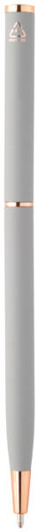 Újrahasznosított alumínium tekerős golyóstoll gumírozott felülettel és rózsaarany részletekkel. Speciális bevonattal rendelkezik a rózsaarany színű tükörgravírozáshoz. Kék tollbetéttel.