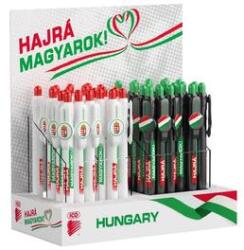 Hajrá magyarok motívumokkal díszített nyomógombos mechanikával működő golyóstoll. Cserélhető X-20-as betéttel. Golyóátmérő: 0,8 mm. Íráshossz: 2500 m. Írásszín: kék. 48 db/display: 24 db fehér+24 db fekete