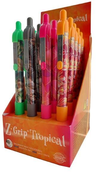 A Z-Grip család új Tropical design-ja, mely limitált kiadásban, különleges külsővel érhető el. 4 szín található a display-ben: narancs, magenta, zöld és szürke. A Z-Grip Tropical tintája lágy, kék színű, szép írásképet biztosít. A gumírozott fogórész és fém klipsz biztosítja a kényelmes fogást és könnyed írást. Display tartalma 20 db.