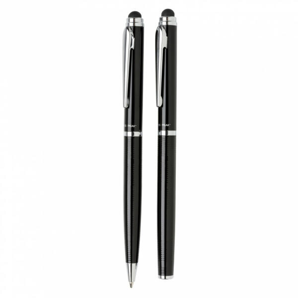 Érintőtoll és érintős töltőtoll ajándékszett. A fekete és fényes kombináció elegáns megjelenést kölcsönöz a terméknek. Henger alakú Swiss Peak ajándékdobozban érkezik.