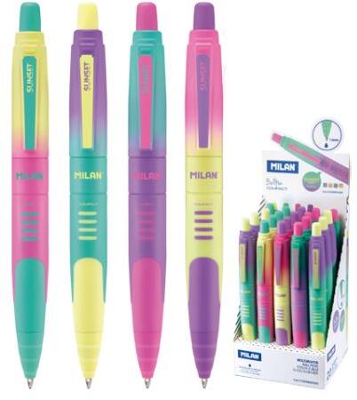 Golyóstoll kompressziós mechanizmussal. Modern dizájn: Sunset Edition. Műanyag toll színes kiegészítőkkel. Sima fogás kellemes tapintású. Töltet színe: kék. Minőségi, Németországban gyártott tinta. Tipp szélessége 1 mm.