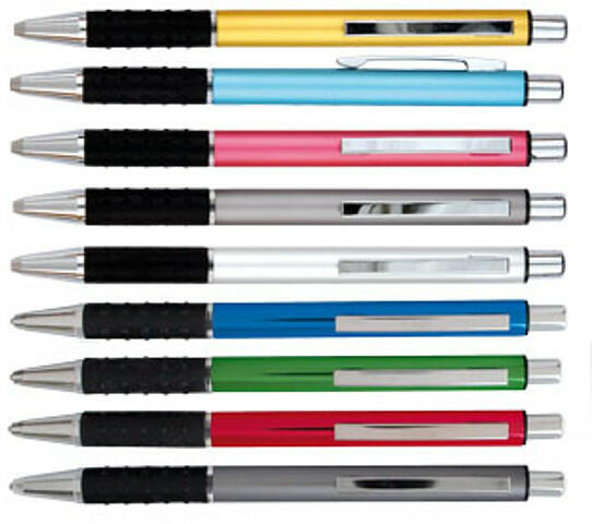Fém nyomógombós golyóstoll, vonalvastagság: 0.7 mm, az írás színe: kék, fekete gumifogóval, a tolltest színe választahtó: kék, rózsaszín, szürke, ezüst, sárga