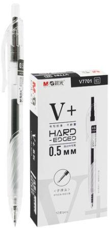 Gél toll az M&G márkától, a "V+" kiadásból. A toll műanyag testtel rendelkezik, gumi markolattal, amely jól illeszkedik a kezedbe. A zselés tölteléket kiváló minőség és tartósság jellemzi. A gél színe fekete . A golyó átmérője 0,5 mm.