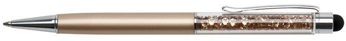 Elegáns kivitelű, kiváló minőségű, eredeti Swarovski® kristályokkal töltött golyóstoll. A tolltest fém, logózható, lézergravírozható. A toll végén található érintővel könnyedén kezelheti okoseszközeit. Elegáns ajándék magánszemélyek és cégek részére. Tolltest színe: arany. Kristály színe: topáz. Betét színe: kék. Vonalvastagság: 0,7mm. Csomagolás: eleg