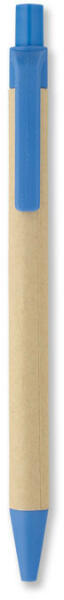 Papír/kukorica PLA golyóstoll Nyomógombos golyóstoll újrahasznosított papírból tolltesttel és PLA (100%-ban biológiailag lebomló kukoricából) részekkel. Kéken író betéttel.