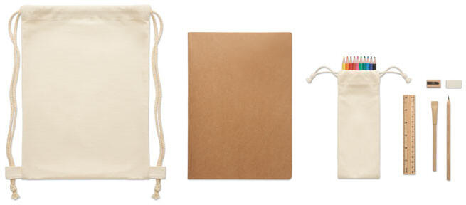 Rajzkészlet zsinóros tasakban Gyerek rajzkészlet. Fa vonalzót, fa hegyezőt, radírt, fa ceruzát, karton golyóstollat, 10 színes ceruzát és 100 sima oldalas (50 lapos) A4-es újrahasznosított papír jegyzetfüzetet tartalmaz. Pamut húzózsinóros tasakban szállítjuk.