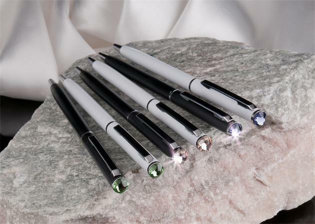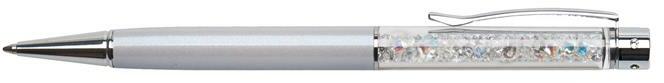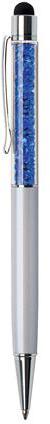 Elegáns kivitelű, kiváló minőségű, eredeti Swarovski® kristályokkal töltött golyóstoll. A tolltest fém, logózható, lézergravírozható Elegáns ajándék magánszemélyek és cégek részére Tolltest színe: krémfehér Kristály színe: zafírkék Betét színe: kék Vonalvastagság: 0,7 mm Csomagolás: elegáns díszdobozban
