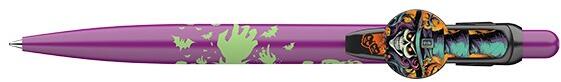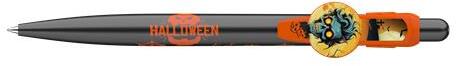 Halloween motívumokkal díszített nyomógombos mechanikával működő golyóstoll. Cserélhető X-20-as betéttel. Golyóátmérő: 0,8 mm. Íráshossz: 2500 m. Írásszín: kék.