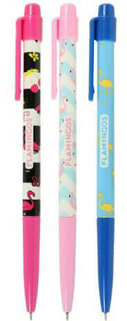 Divatos flamingó mintás, kéken író golyóstoll. Nyomógombos kivitel. Golyóátmérő 0,5 mm. Műanyag tolltest. 3-féle mintával rendelhető. Az ár 1 darabra vonatkozik.