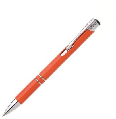 OIRA műanyag golyóstoll fém tartozékokkal. Kék utántöltő nagy mennyiségben. Színe narancssárga.