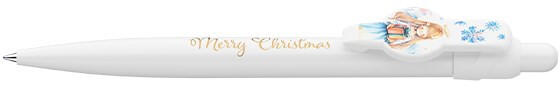 Golyóstoll ICO Xmas fehér Nyomógombos mechanikával működő golyóstoll, amelyen karácsonyi elemek díszítik a tolltestet és Angyalka nyomat a klipszet. Cserélhető X-20-as kék színű golyósbetéttel. Írásvonalvastagság: 0,8 mm.