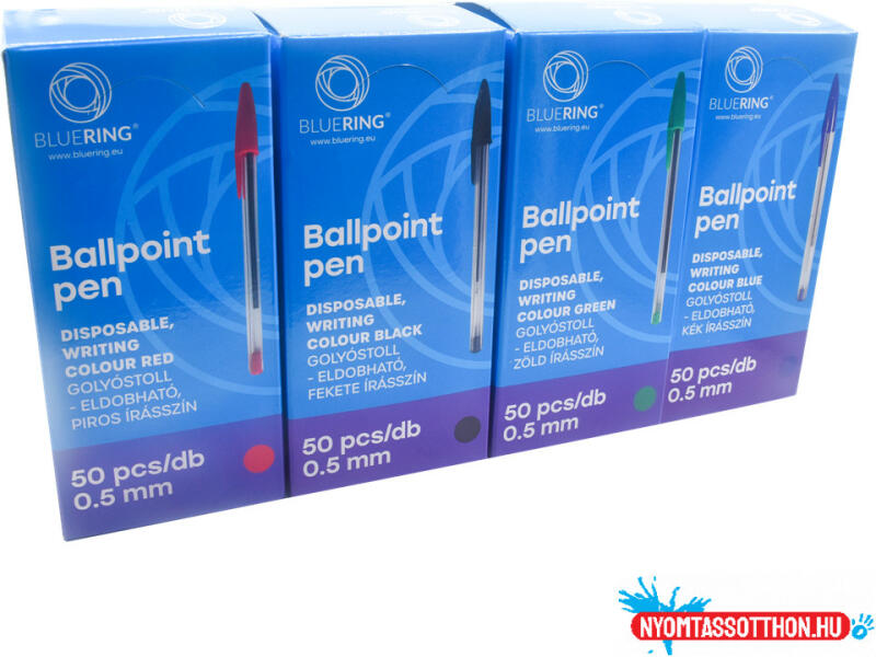 Golyóstoll eldobható kupakos Bluering® írásszín fekete Eldobható, kupakos golyóstoll műanyag testtel. A kupak színével megegyező tinta. A kép illusztráció. Az ár egy darabra érvényes.