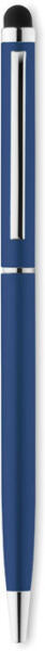 Golyóstoll érintőheggyel Újrahasznosított alumínium csavarmechanikás golyóstoll fényes króm csíptetővel és puha érintőhegy véggel. Kéken író betéttel.