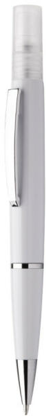 Műanyag golyóstoll kék tollbetéttel és tetején fertőtlenítő spray-vel. Kapacitás: 3 ml. Fertőtlenítő folyadék nélkül szállítjuk.