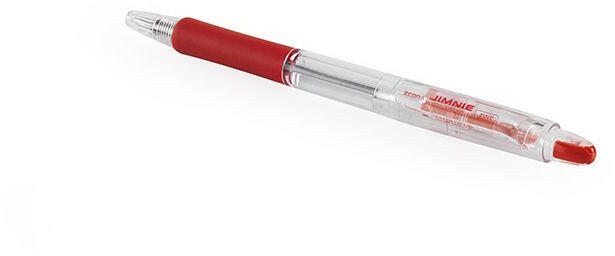 Cserélhető betétes, áttetsző testű, klasszikus nyomógombos golyóstoll gumírozott markolattal. Golyóátmérő: 0,7 mm, írásvastagság: 0,24 mm. Tinta színe PIROS. Betét: K. 12db/gyűjtő, 1152db/karton. Katalóguskód: 776