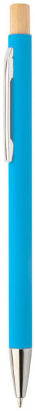 Újrahasznosított alumínium golyóstoll gumírozott felülettel, bambusz gombbal és króm részekkel. Speciális bevonattal rendelkezik, amely különlegesen fényessé teszi a gravírozott emblémát. Kék tollbetéttel szállítjuk.