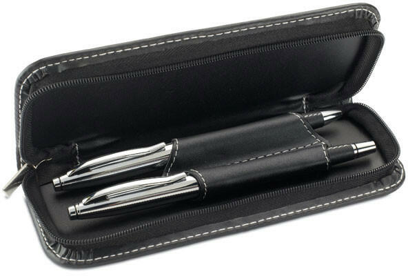 Golyóstoll-roller irón szett Golyóstoll és roller toll szett cipzáras PU bőr tokban, kontrasztos varrással. A golyóstoll kék, a roller feketén író betéttel.