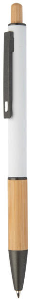 Újrahasznosított alumínium golyóstoll bambusz markolattal és gombbal, gumírozott testtel és fémes részekkel. Kék tollbetéttel szállítjuk.