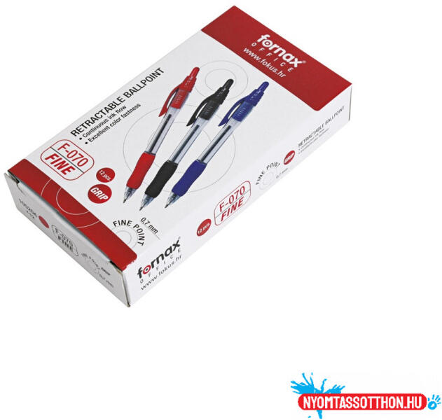 Golyóstoll Fornax F-70 grip, írásszín kék Átlátszó testű nyomógombos tollszerkezet és gumírozott tolltest. Bordázott fogórész. Egyedi kialakítású test design! Írásszíne megegyezik a nyomógomb és a fogórésszel. Golyóméret: 0,7 mm, Írásvastagság: 0,33 mm. A kép illusztráció. Az ár egy darabra érvényes.