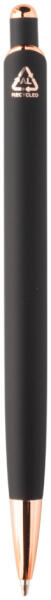 Újrahasznosított alumínium golyóstoll gumírozott felülettel és rózsaarany részletekkel. Speciális bevonattal rendelkezik a rózsaarany színű tükörgravírozáshoz. Kék tollbetéttel.