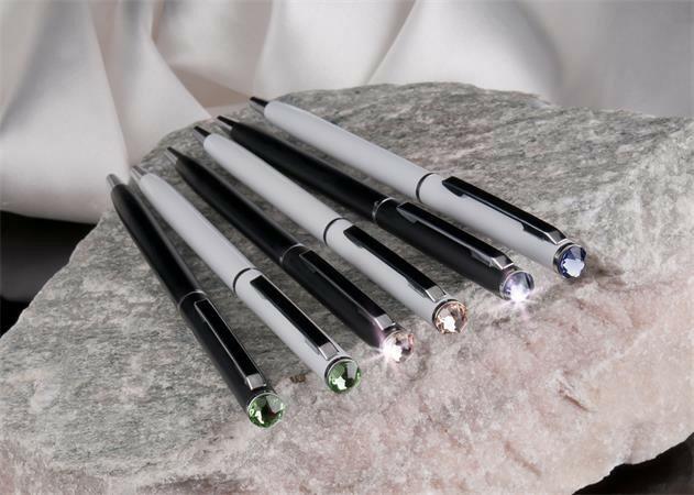 Klasszikus kivitelű, eredeti Swarovski® kristállyal díszített golyóstoll. Rendkívül kedvező ár-érték arány. A tolltest fém, logózható, lézergravírozható. Tolltest színe: fehér. Kristály színe: peridot zöld. Betét színe: kék. Vonalvastagság: 0,7mm. Csomagolás: bársonytokban.