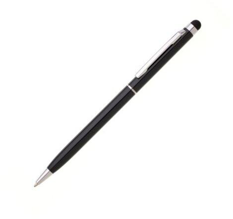 Vékony fém golyóstoll forgó mechanizmussal és hegyével az érintőképernyő vezérléséhez. Ezüst króm kiegészítők, kék kitöltő kereszt. Anyaga alumínium.