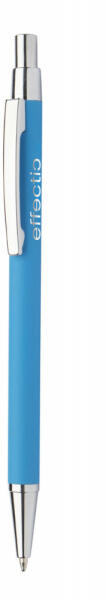 Alumínium golyóstoll gumírozott felülettel. Kék tollbetéttel szállítjuk. Speciális bevonattal rendelkezik, amely különlegesen fényessé teszi a gravírozott emblémát.