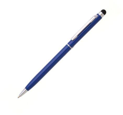Vékony fém golyóstoll forgó mechanizmussal és hegyével az érintőképernyő vezérléséhez. Ezüst króm kiegészítők, kék kitöltő kereszt. Anyaga alumínium.