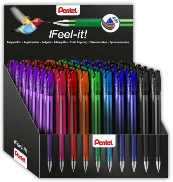 Kupakos golyóstoll, 8 élénk színben, 0,7mm golyóátmérő=0,35 mm írásvastagság, nagy fedőképességű, alacsony viszkozitású olajbázisú tintával, rendkívül könnyen író golyóstoll; rendkívül könnyű és vékony tolltest gumírozott, háromszög fogózóna; az átlátszó tolltesten a tintával való töltöttség folyamatosan látható. A displayen 60 db golyóstoll találha