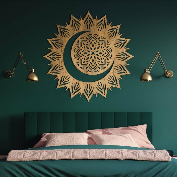 Fábol készült dekoráció - Nap és Hold mandala egyedi dizájnban egy remek kép a lakásba és gyönyörűen fog mutatni a nappali vagy a hálószoba falán. A fa mandalák nagyon népszerűek és keresett dekorációk a pozitív pszichológiai hatásaik miatt. Pozitív energiát sugároznak a belső térbe és boldogságot hoznak. Jelentése: A Nap és Hold mandala magában hordozza az unive