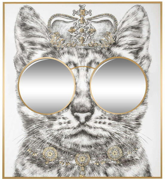 KING CAT 193 x 213 cm kép. Gyönyörű, modern nyomtatás egyszínű, visszafogott színekben, arany részletekkel, koronát és feltűnő napszemüveget viselő macskát ábrázol. A szemüveget egy tükrös elem emeli ki, amely egyedi jelleget és eleganciát kölcsönöz a kompozíciónak. Ez a szokatlan, tükörhatású dekorációs forma tökéletesnek bizonyul a modern belső terekbe, magá