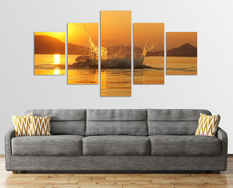 Balatoni csobbanás 5 részes vászonkép/ Méret: 125cm X 70cm Magyarország legnagyobb állóvize, és legnépszerűbb üdülő célpontja a Balaton feszített vászonkép formájában idéz nyári hangulatot otthonába. A Balaton (becenevén „a magyar tenger) magyarországi tó a Dunántúlon, Közép-Európa legnagyobb tava, Magyarország vízrajzának meghatározó eleme. Könnyen felmelege
