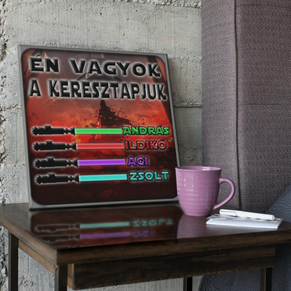 Igazi Star Wars rajongó keresztapukák számára készítettük el ezt a személyre szabható Star Wars vászonkép ajándékot. Ne hagyd ki ezt a lehetőséget, hogy megmutasd keresztapukádnak, mennyire fontos számodra! Adj neki egy olyan ajándékot, ami egyszerre személyes, exkluzív és tele van Star Wars varázslattal. Ha a fénykard és a név színén is szeretnél változtatni akkor a