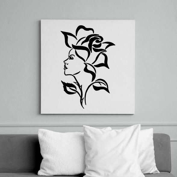 A fából készült fekete-fehér kép egy női arcot ábrázol, amelyet virágzó virágok vesznek körül. Ez a tökéletes kombináció modern és romantikus dizájnt kölcsönöz, amely bármilyen belső térhez illik. A kép jelentése: A nő arca finoman felfelé néz, ami belső nyugalmat sugall, és ezt a harmóniát továbbítja a környezet felé is. A nő fején lévő virágok a termé