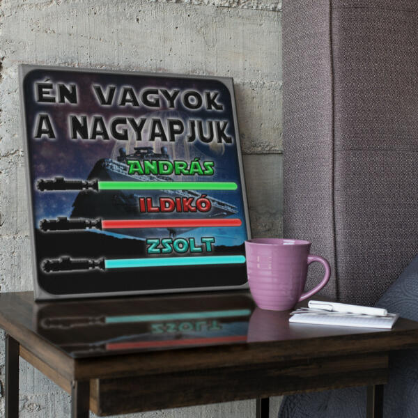 Igazi Star Wars rajongó nagyapukák számára készítettük el ezt a személyre szabható Star Wars vászonkép ajándékot. Ne hagyd ki ezt a lehetőséget, hogy megmutasd nagyapukádnak, mennyire fontos számodra! Adj neki egy olyan ajándékot, ami egyszerre személyes, exkluzív és tele van Star Wars varázslattal. Ha a fénykard és a név színén is szeretnél változtatni akkor a név m