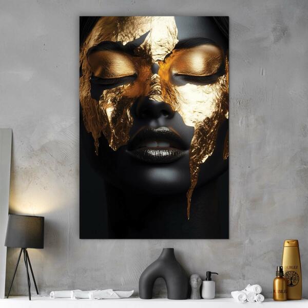 A fa kép egy női portrét ábrázol, amelynek arca arany levelekkel van borítva. A fekete és arany közötti kontraszt egy olyan képet alkot, amely azonnal megragadja a figyelmet. Az arcon lévő finom arany részletek luxusos és modern megjelenést kölcsönöznek a képnek. A női portré tökéletesen illik a modern és minimalista belső terekbe, ahol stílust és eleganciát ad a térne