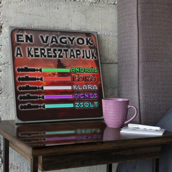Igazi Star Wars rajongó keresztapukák számára készítettük el ezt a személyre szabható Star Wars vászonkép ajándékot. Ne hagyd ki ezt a lehetőséget, hogy megmutasd keresztapukádnak, mennyire fontos számodra! Adj neki egy olyan ajándékot, ami egyszerre személyes, exkluzív és tele van Star Wars varázslattal. Ha a fénykard és a név színén is szeretnél változtatni akkor a