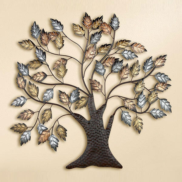 Nagy méretű fémből készült fát ábrázoló fém fali dekoráció. A fali dekoráció, arany, ezüst és barna színekben pompázik. A fém fali dekoráció mérete: 72x70cm