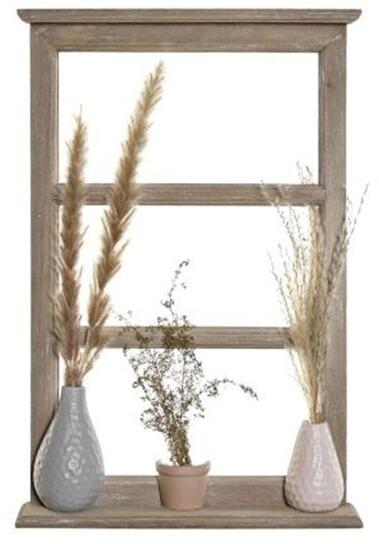 Natur színű fa keretben lévő csodás szárazvirág kompozíció kis vázákkal, ablakos formában. A natur fa keretben lévő szárazvirág kompozíció mérete: 30x5x45cm.