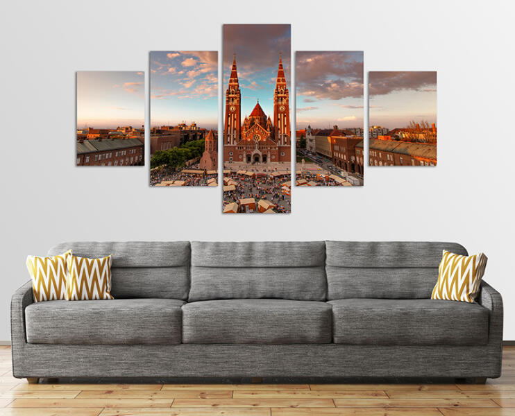 Fogadalmi Templom Szeged 5 részes vászonkép/ Méret: 125cm X 70cm Szeged jelképe, az ország negyedik legnagyobb temploma a neoromán stílusú Fogadalmi Templom vászon falikép formájában díszítheti otthonát. A Szegedi Dóm Schulek Frigyes tervei alapján épült. A dóm falait borító színpompás díszítés a XX. századi magyar művészet egyik legszebb alkotása.