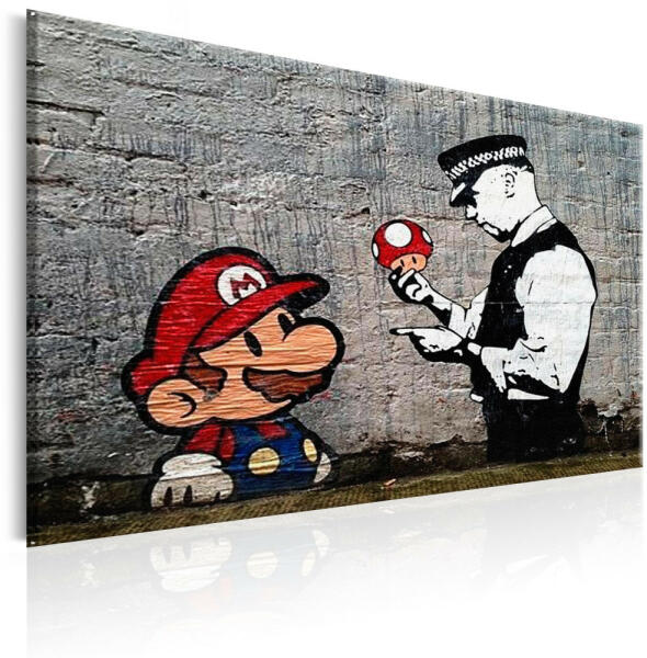 h-B-0080-b-a A magas minőségű "Mario and Cop by Banksy" képet speciális flíz vászonra nyomtatjuk. Ez a sok, boltunkban megrendelhető eredeti minták egyike. Legjobb minőségű nyomtatás! A speciális vászon a megfelelő nyomtatási minőséggel együtt garantálja a kép tökéletes minőségét, valamint a színek mélységét. Nyomtatott szélek A kép nem igényel keretet, egyből fe
