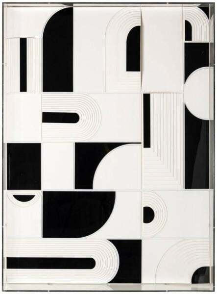 Lenyűgöző, modern falikép dinamikus fekete-fehér geometriai mintázattal, átlátszó keretben. Ez a 95x70 cm-es művészi alkotás tökéletesen ötvözi a fa, MDF és papír elemeket egy egyedi, absztrakt kompozícióban. Modern elegancia és dinamikus design egyetlen műalkotásbanA Richmond Dynamic falikép egy lenyűgöző absztrakt kompozíció, amely a modern művészet és a kifinomul
