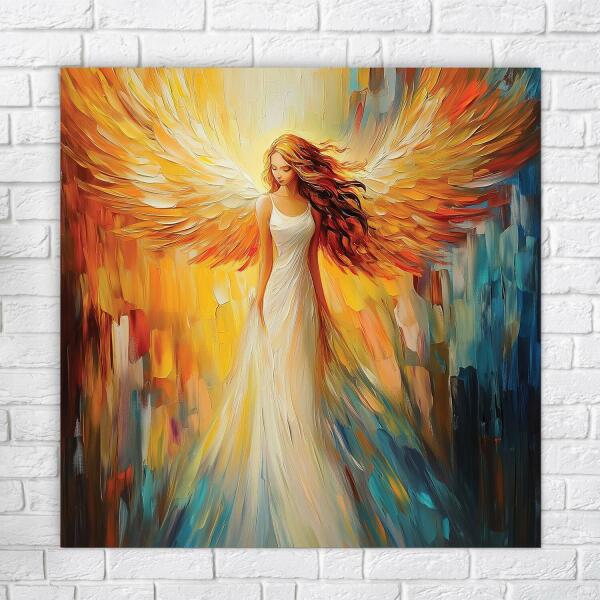 A széttárt szárnyú angyalt ábrázoló fából készült kép gyönyörű és szimbolikus fali dekoráció. Az élénk színek és a részletes ecsetvonásokkal megjelenített árnyalatok a fa alapon festményszerű hatást keltenek. Az angyal kép ideális a nappaliba, hálószobába vagy a folyosóra, és tökéletes ajándék lehet édesanyának, nagymamának vagy bármely fontos nőnek az