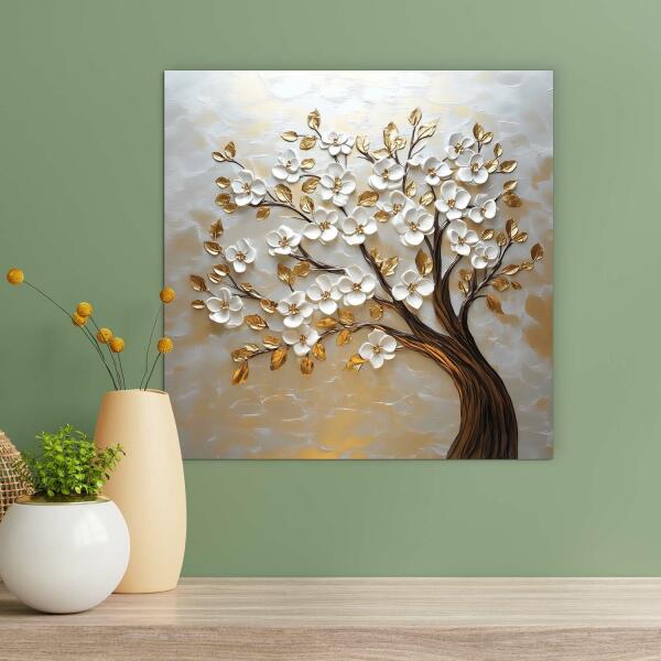 A lenyűgöző 3D kép gazdagon díszített fehér virágokkal és arany levelekkel ékesített fát ábrázol fehér árnyalatokban, amelyek luxusos megjelenést kölcsönöznek. A stílusos színpaletta és a látható textúrák eleganciát és kifinomultságot hoznak minden térbe. A fából készült fa motívumú kép ideális konyhai étkezőasztal fölé vagy a nappali kanapéja fölé. Eg