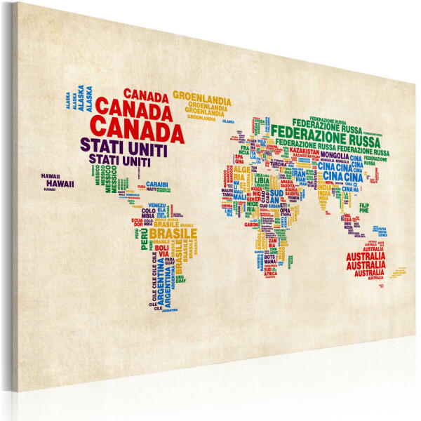 020113-97 A magas minőségű "Olasz nevek országok élénk színekben" képet speciális flíz vászonra nyomtatjuk. Ez a sok, boltunkban megrendelhető eredeti minták egyike. Legjobb minőségű nyomtatás! A speciális vászon a megfelelő nyomtatási minőséggel együtt garantálja a kép tökéletes minőségét, valamint a színek mélységét. Nyomtatott szélek A kép nem igényel keret