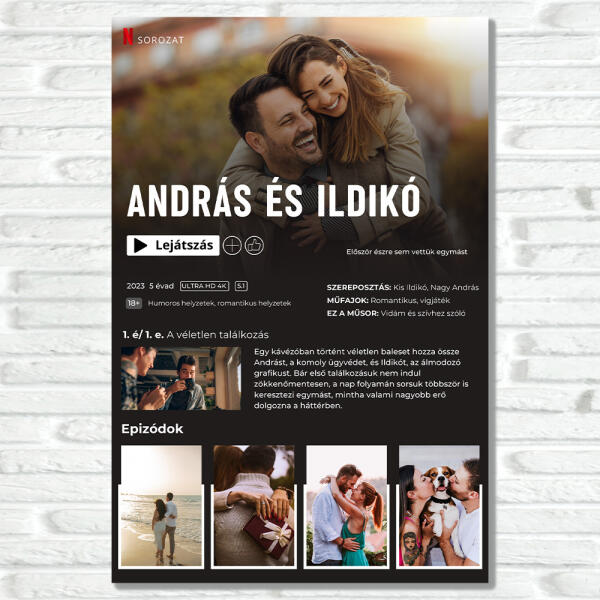 Lepd meg párodat egy igazán különleges és kreatív ajándékkal! Egy személyre szabott Netflix sorozat bemutató oldal vászonkép formájában, amelyet a kapcsolatotok legszebb pillanatai tesznek igazán egyedivé. Ez az aranyos és romantikus dekoráció nemcsak időtálló emlék, hanem a közös otthonotok tökéletes kiegészítője is – bármilyen alkalomra tökéletes választás! M