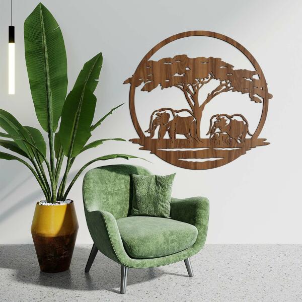 Az Elefántok című kép részletesen kifaragott fából készült, és két felnőtt elefántot, valamint egy kis elefántot ábrázol, amint békésen pihennek egy fenséges akáciafa alatt. Precíz kidolgozása révén tökéletes választás nappaliba, hálószobába, irodába, vagy bármely helyiségbe, ahol természetes és művészi hangulatot szeretne teremteni. Az elefánt fakép egyedi